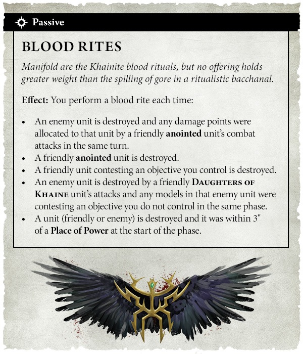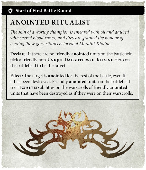 The Daughters of Khaine are getting a new battle trait to play with. It involves spilling blood and passing the Anointed keyword around.