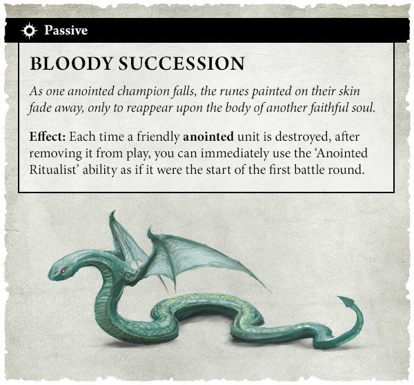 Here get a look at the Anointed Ritualist rule. This one is kind of weird. At first you’d think this was a boon to the anointed. However, this power really kicks in when one (or more) of the anointed units gets destroyed. Suddenly, they now get the Exalted Abilities from the Destroyed anointed units on their warscroll…