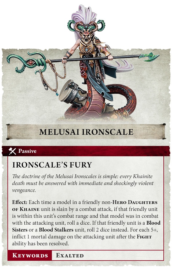 And you can kind of see how that would start to stack-up. Heck, you could even select a sacrificial lamb (or two) in order to really boost the hero you want to take it to the enemy by the end of the game. It’s kind of like a really messed-up shell game of passing powers around. One example GW used was the Melusai Ironscale. Wouldn’t it be nice to have Ironscale’s Fury on a different hero?