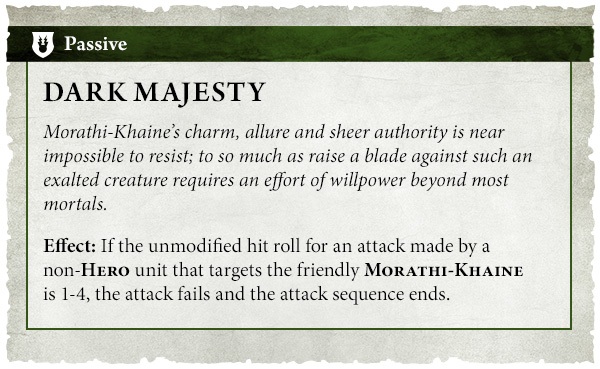 Basically, if you opponent’s non-hero units attack her and don’t roll a 5 or 6, they just miss. That’s going to give her a big boost to survivability (not that she really needed one). Still, she’s kind of the lynchpin to the army so having her around for longer is just better for DoK players.