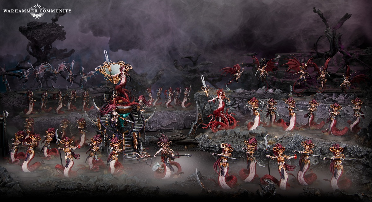 The army can include Melusai Ironscales, Blood Sisters, Blood Stalkers, Khinerai Heartrenders, Khinerai Lifetakers, Bloodwrack Medusae, and Bloodwrack Shrines, but MUST be led by Morathi-Khaine and the Shadow Queen.