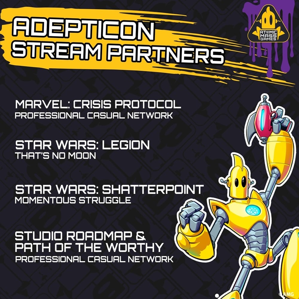 If you’re a fan of Star Wars: Legion, Star Wars: Shatterpoint, and/or Marvel: Crisis Protocol then you’re going to want to tune in tonight for the AMG Roadmap stream. It’s going to be at AdeptiCon 2026 and if you’re like me, you’ve been wondering how you can watch. Well, I’ve done some digging and found the announcements so you don’t have to!