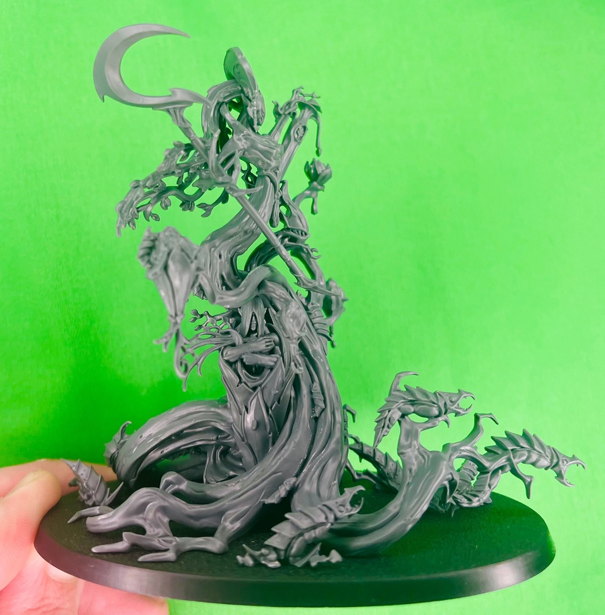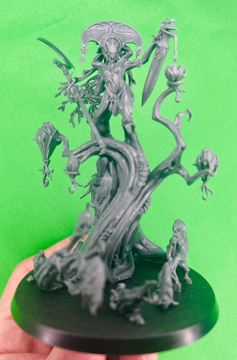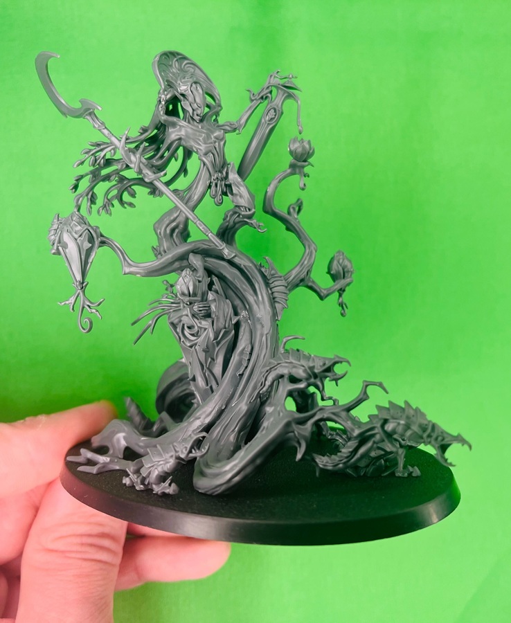 Reguardless of how you paint it the miniature is certainly on point for the Sylvaneth. This is clearly another Dryad-like wood spirit inhabiting some gnarly tree. There’s load of details all over this miniature. In particular, I wanted to point out the Tree-Revenant that’s being uh…grown(?) on the side. That’s a neat detail.