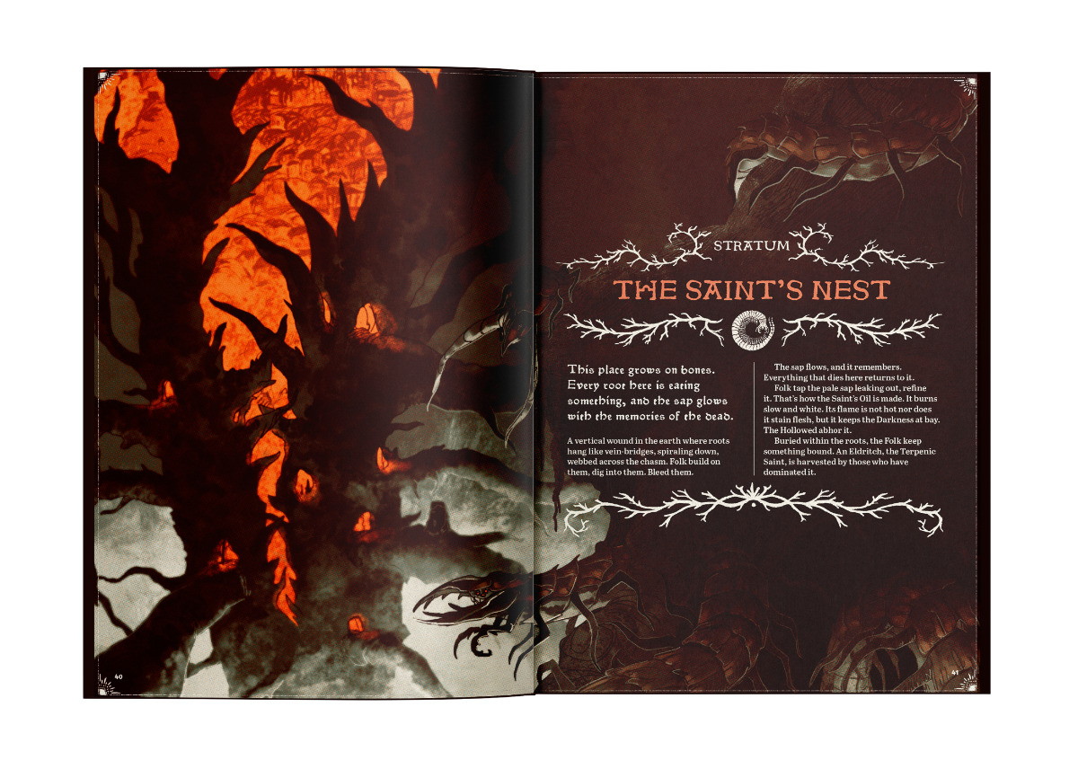 “Fomoria is a dark, weird, and inhospitable subterranean world where the Sun is a myth and the ‘False Stars’ of the earth’s roof offer the only light. Powered by a modified MORK BORG engine, players take on the role of the Folk – children of the lost Surface – navigating a living, breathing labyrinth of shifting tunnels known as the Strata.”