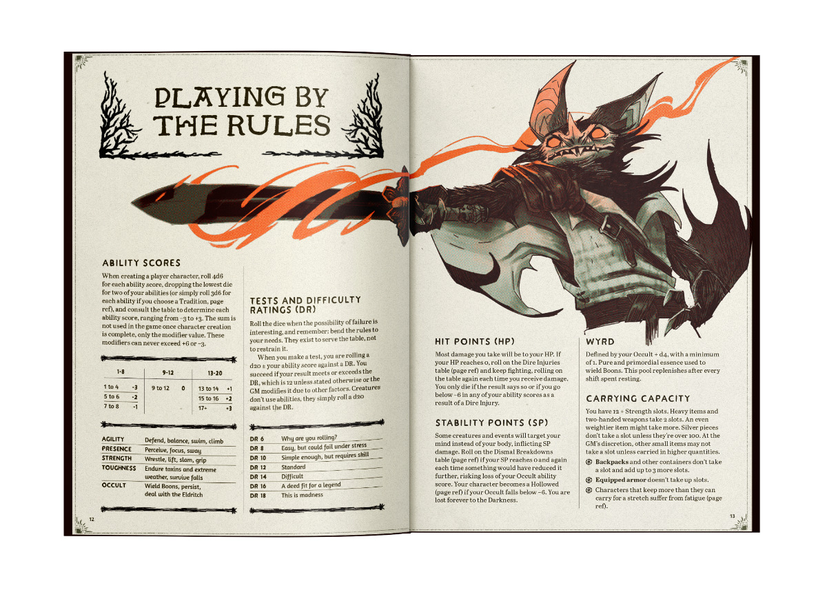 First and foremost, this is a release under Free League’s ‘Workshop’ label, which is the branch responsible for externally developed games. That’s how MORK BORG is over there in the first place, I do believe. But if you’re familiar with the dark aesthetics of either, you can get a good idea of what to expect.