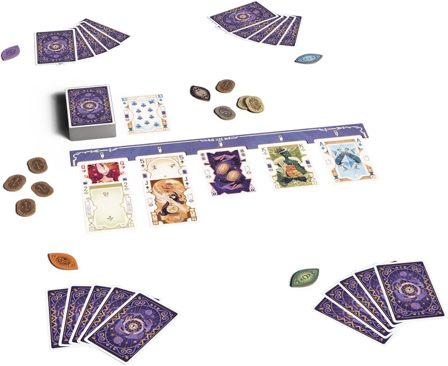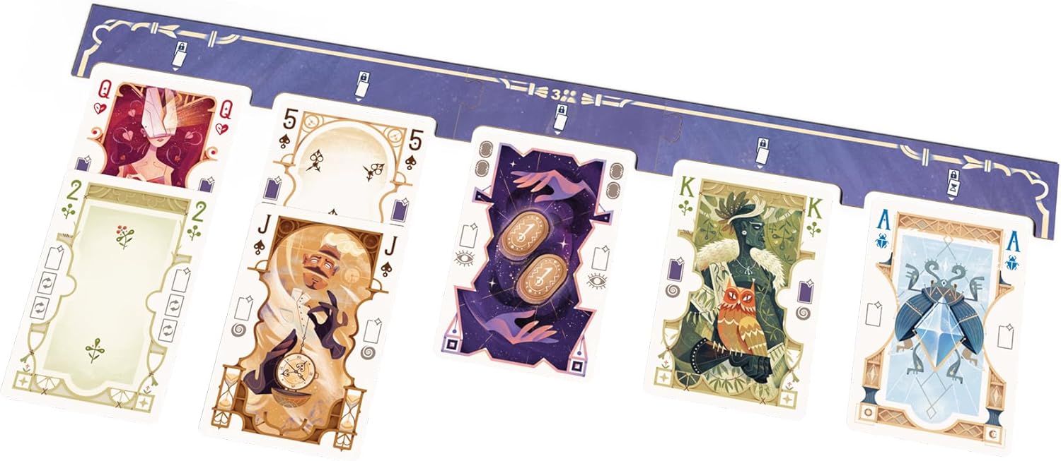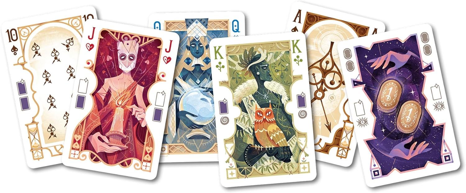 Cards are picked up, moved, hidden, displayed, discarded, passed, and played, as players keep an eye on what other players are doing and try to predict how the game will finally end. The artwork is gorgeous and looks like it would be more at home on a deck of tarot cards as opposed to playing cards, and games are quick, fun, competitive, and very replayable.