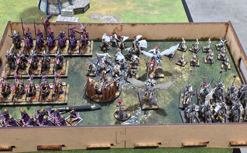 At this point the Chaos side was looking pretty thin, but we were beat up. Figuring we were ahead on points we pulled back and attempted to avoid any more risk. However Raising Havok wasn’t having any of it. They threw everything at us in one last ditch effort. The managed to vile tide my BSB and we had a big complicated fight int he center with a lot of what was left of both sides there. The turning point was me making 5 out of 6 6+ Lady’s Blessing saves with my knights, and then doing 4 wounds in return with the Knights (not charging) to the Skin Wolves. This was the final straw and let us mop up. In the end though our units had taken a real beating we pulled off a 14 point win.