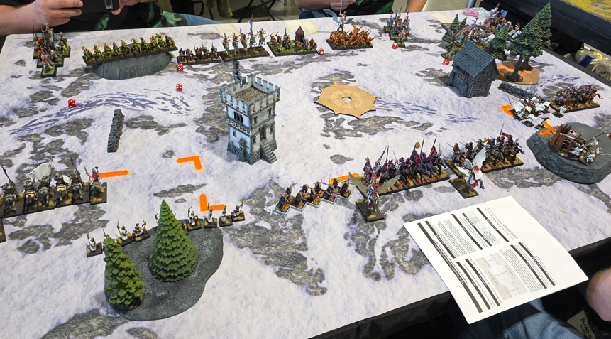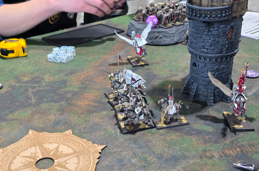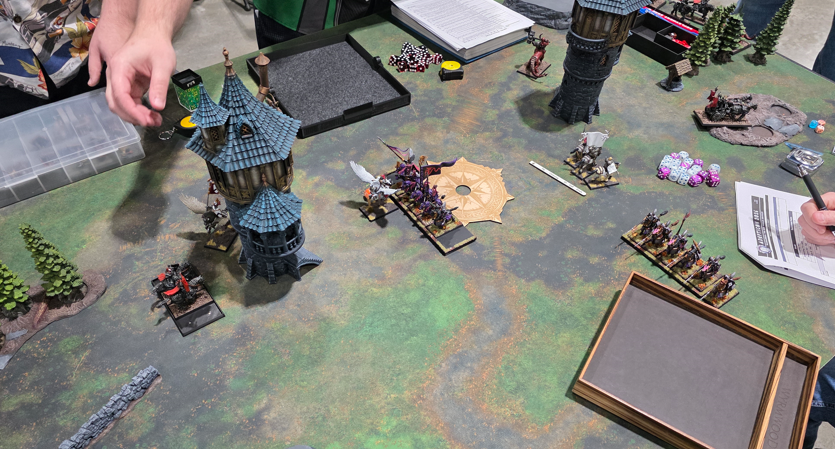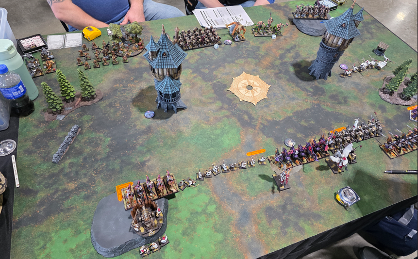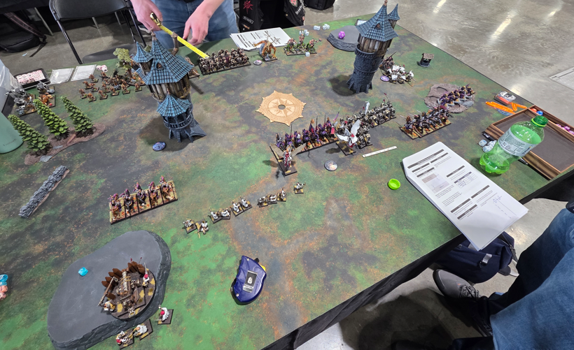 Unfortunately they did not submit their lists online so I don’t have an exact copy of what they ran. The Brets had a lance of Grail Knight, two small Knights of the Realm, a unit of Grail Pilgrims, a Baron on Peg, and a small unit if Men-At-Arms. The Wood Elves had some Sisters of the Throne, archers, an eagle and a big block of Rangers. I can’t recall what they had for characters. Both Grant and Cody were really great guys and a ton of fun to play, but didn’t have a ton of experience with the game.