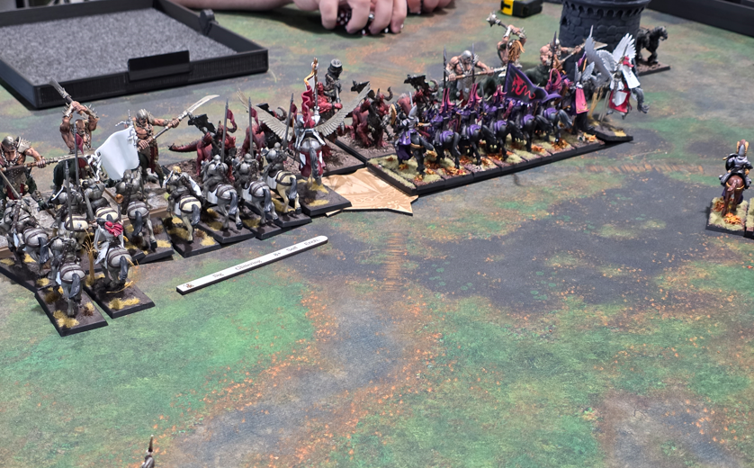 In the center we decided to also go all in, avoiding the Shaggoth we charged the all 10 of the Dragon Ogres. On the right my Baron and the DPs destroyed 5 of them. However on the left the weaker punch of my Knights and BSB only managed to hurt them and make both units Fall Back in Good Order. But that was just turn 1.
