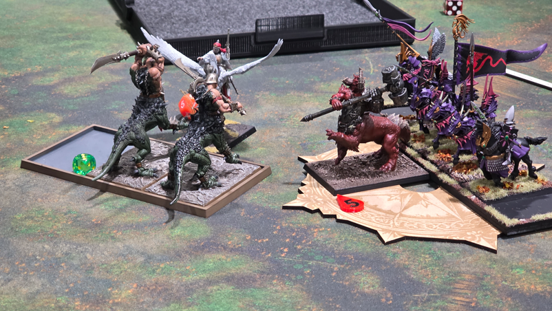 This was another fun game and Brandon and Jim were great guys. It was also pretty intimidating setting up across from a solid wall of 10 Dragon Ogres. This was also a pretty straight forward game, they went first and came right as us. On the flanks we were able to kite their frenzied units. This kept the chariot lord from doing anything, and let us shoot up the Knights, though they did eventually get the Brigands and Cannon (after it Misfired 3 turns in a row).