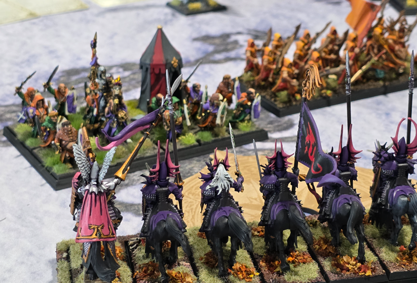 Brandon’s Elves followed a similar hard hitting approach. He brought a very dangerous unit in the Dragon Princes. The two nobles rode with them for extra attacks. The unit also rocked in with 3 castings of Hammerhand, letting it put out a real ton of attacks. He also brought some chaff and light shooting. For magic we just had a single lvl 1, mostly there to cast glittering robes and maybe dispel something. Overall it was built to be flexible and hit hard.
