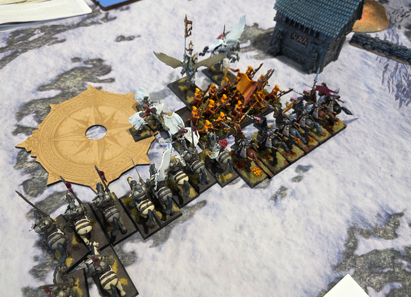Brandon and I picked a pretty aggressive list with some strong hitting power, and some ranged support. With only 250 pts to spend on any character or unit you face some real limitations. The Bret Baron on a Barded Peg is just about hitting that point cap and one the best combat characters you can take at these points. My half the of the list was based around him and the BSB rocking in with a static 3 comabt res to fly around and do some damage. I had a bit of shooting and a nice block of knights to hit things.