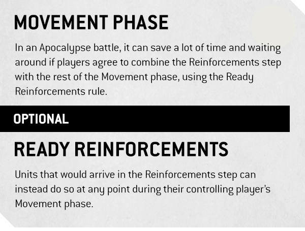 In big team games with massive hordes of miniatures, for instance, you don’t always want to wait for your friend with 120 Kroot Carnivores to finish his Advances before Deep Striking your single unit of Warp Spiders onto the table. With the Ready Reinforcements rule, you can now do your Reinforcement step at any point during the phase – easy as that.