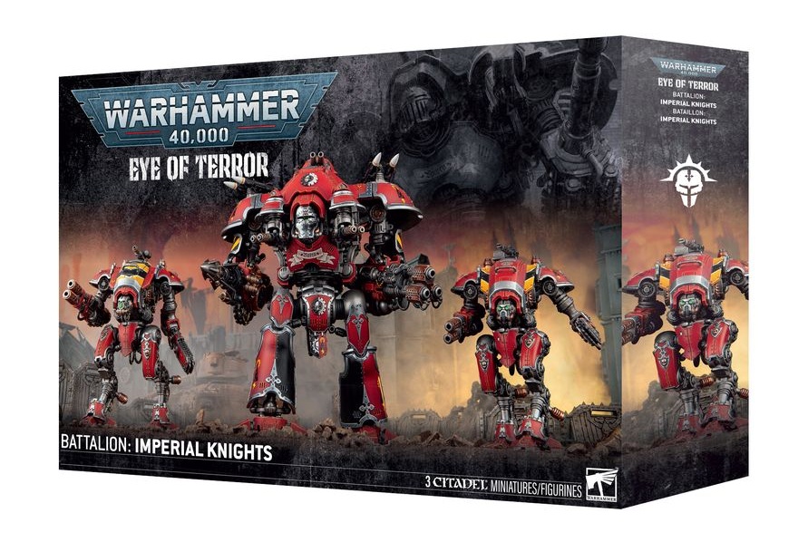 This boxed set is ideal for starting a new Imperial Knights collection – or expanding an existing army – to unleash in games of Warhammer 40,000, and save money compared to buying the kits separately. Two Armiger-class Knights scout ahead, fast and agile. Though smaller than other classes of Knight, they’re still devastating war machines in their own right. The star of the show is a massive Knight Valiant, which can alternatively be built as a Knight Castellan – these colossal suits tower over the battlefield. They are ideal for representing a Freeblade Company Detachment – the rules for which are found in Eye of Terror: Reign of Iron – Detachments, available separately, and also on the Warhammer Community website.