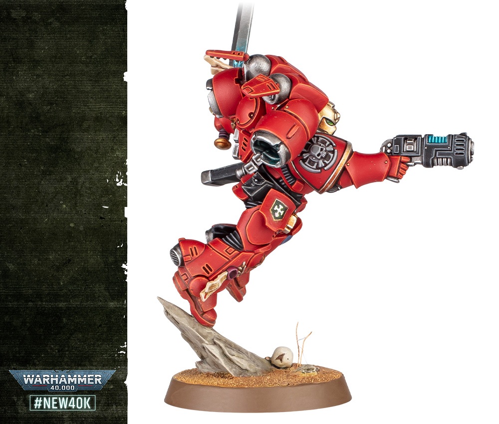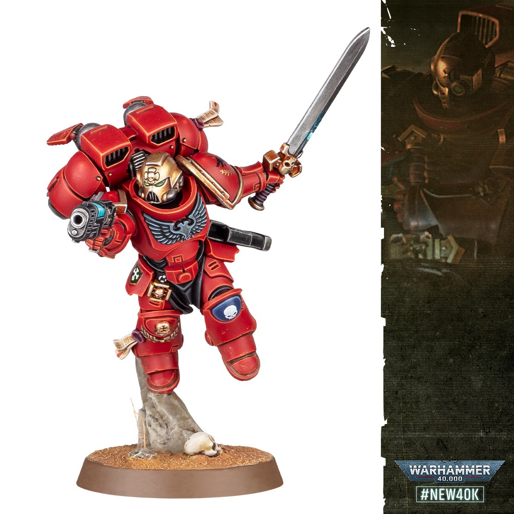 The golden helmet marks out this Blood Angel as a veteran. He’s also wielding an impressive master-crafted weapon and a plasma pistol, and his armour is festooned with additional iconography and a crux terminatus, just to underline his status within the Chapter.