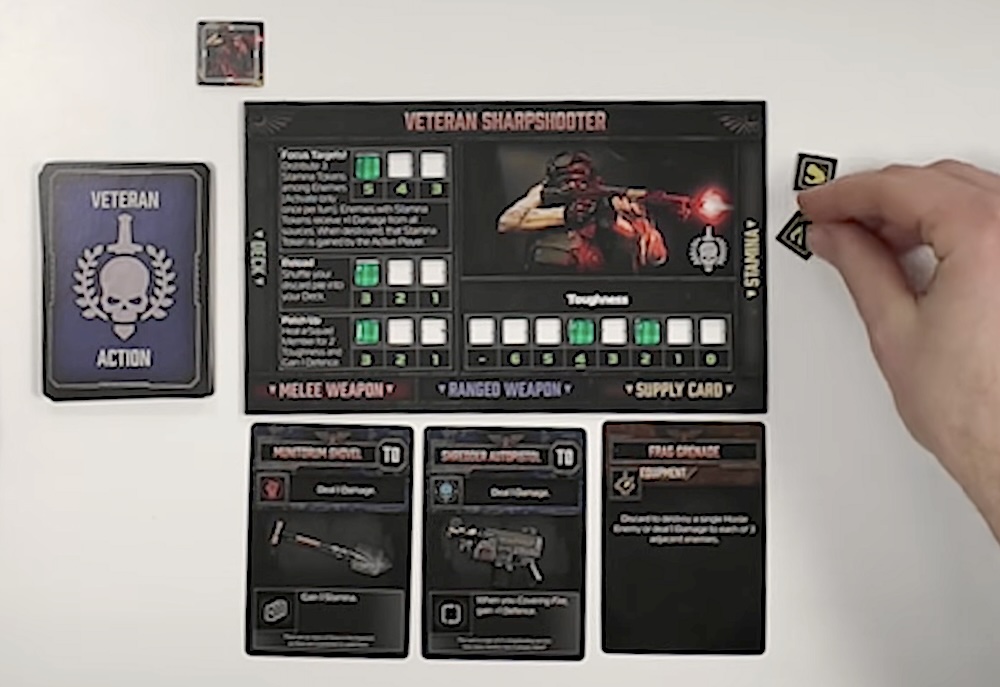 To set up a game of Darktide the Card Game, players will need to set up their Command Card – this keeps track of your six missions as well as your resources, your ‘Front of Tide’ card – it helps keep track of your squad defense, and pick a player archetype and the corresponding player board and action deck. Green chits can be used to keep track of the various scores, abilities, and bars on these boards. Finally, players will need to layout the enemy and event cards face-down.