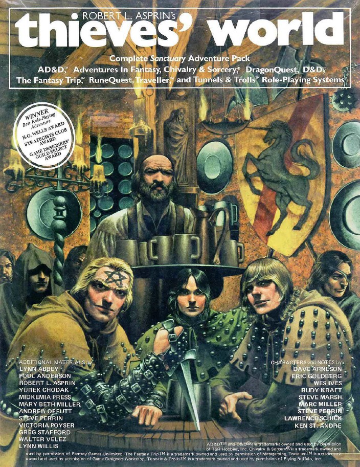 My first encounter with multi-system publishing was the Thieves’ World boxed set, which included eight (8!) sets of stats for that iconic low-fantasy setting. The lead system was RuneQuest, of course, but they also covered Tunnels & Trolls, Advanced Dungeons & Dragons, Adventures in Fantasy, Chivalry & Sorcery, DragonQuest, The Fantasy Trip, and Traveller.