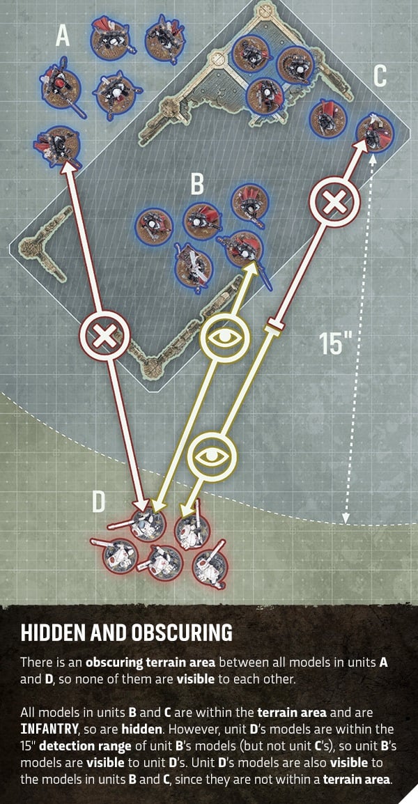 What this means is that while they are hidden, they are only visible to enemy units that are within detection range. This range is typically 15″ but I have a funny feeling there may be other rules that play around with that range. Game-wise, if a unit can’t draw line of sight (visible) to a target they can’t fire at them. That said, I’m curious to see how this will interact with weapons that don’t require line of sight. It makes sense that an unit of mortars could just shell an area without knowing if the enemy is there or not. Regardless, this should open up some interesting opportunities for deployment and tactics in game later.