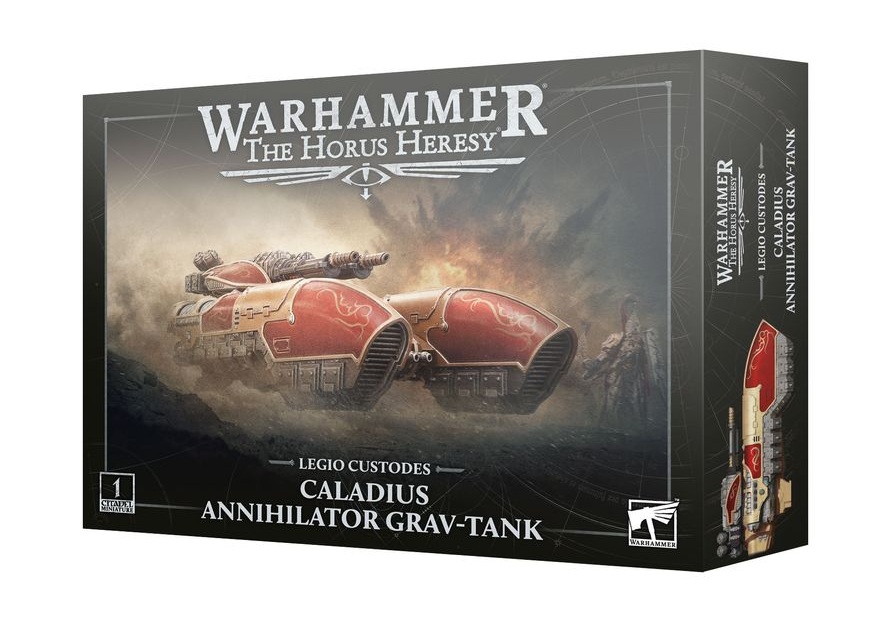 This multipart plastic kit builds one Caladius Annihilator Grav-tank, a swift, powerful tank for your Legio Custodes armies in games of Warhammer: The Horus Heresy. Equipped with a turret-mounted twin Arachnus blaze carronade, it can shred even power-armoured infantry in an instant, making for a potent addition to your heavy arsenal. Combined with a fast and well-armoured chassis, this tank can turn the tide of battle in your favour. Its sleek design and antigrav technology make it stand out from the tracked vehicles used by the Legiones Astartes and Solar Auxilia, and it has a choice of hull-mounted weapon – either an infantry-slaying twin lastrum bolt cannon or a horde-clearing twin neutronium cascade projector.