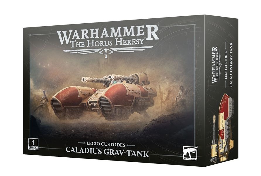 This multipart plastic kit builds one Caladius Grav-tank, a swift, powerful tank for your Legio Custodes armies in games of Warhammer: The Horus Heresy. Equipped with a turret-mounted twin Iliastus accelerator cannon, it can punch holes in enemy transports and lighter tanks, while leaving power-armoured foes as little more than red smears on the battlefield. Combined with a fast and well-armoured chassis, this tank can turn the tide of battle in your favour. Its sleek design and antigrav technology make it stand out from the tracked vehicles used by the Legiones Astartes and Solar Auxilia, and it has a choice of hull-mounted weapon – either an infantry-slaying twin lastrum bolt cannon or a horde-clearing twin neutronium cascade projector.