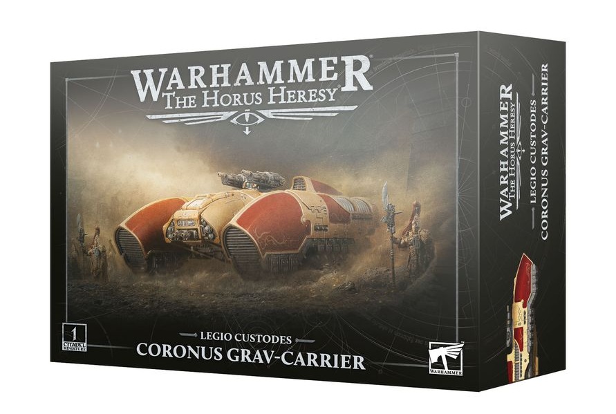 This multipart plastic kit builds one Coronus Grav-carrier, a well-armoured troop transport for your Legio Custodes armies in games of Warhammer: The Horus Heresy. Capable of quickly ushering your elite warriors safely to the frontline through heavy firepower, it’s a crucial asset for any rapid assault force. Its primary weapon is a turret-mounted twin Arachnus blaze cannon, allowing it to provide fire support to its passengers after they’ve disembarked. Its sleek design and antigrav technology make it stand out from the tracked vehicles used by the Legiones Astartes and Solar Auxilia, and it has a choice of hull-mounted weapon – either an infantry-slaying twin lastrum bolt cannon or a horde-clearing twin neutronium cascade projector.