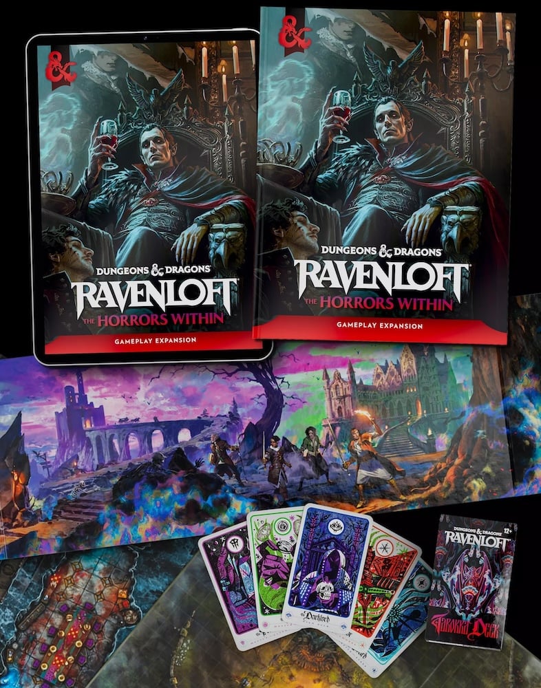 Accompanying Ravenloft: The Horrors Within are the tie-in accessories for Ravenloft are included in the Ultimate Bundle. This includes a new Tarokka Deck, not to be confused with the Tarokka Deck that came out a few years back. The new Tarokka Deck will have 60 “Tarot-style cards” designed to work with the book. It’s not a bad idea, I like it as far as those things go. You’ll also get a themed DM Screen and Pathfinder-style Flip-Mat pack with double-sided poster maps and token sheets.