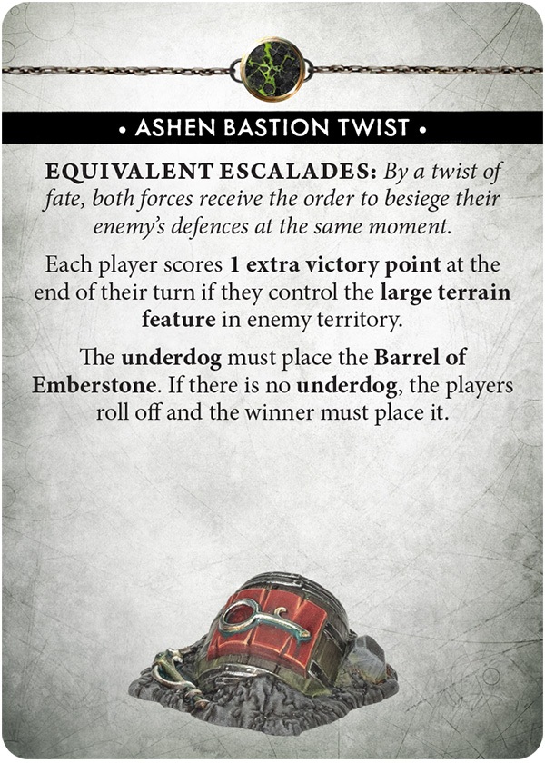 For the Ashen Bastion Twist, they have a bonus for taking over a large terrain feature. But the underdog gets to place a Barrel of Emberstone. That can have some explosive results …but maybe not exactly how you think.