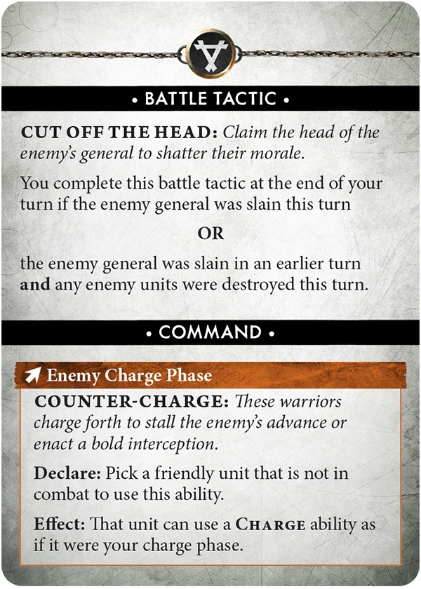 The next combo card is Cut off the Head / Counter-Charge. The Battle Tactic is all about killing the enemy and scoring points that way. Thankfully, there’s two ways to score it as well.