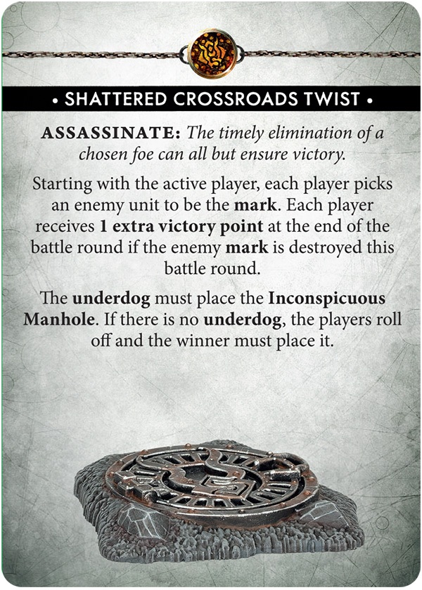 Now, as far as Twists go, there’s also a few of these depending on which check you’re using. The Shattered Crossroads has a Twist of assassination. It also comes with a fun “Inconspicuous Manhole” which is totally normal and a unit is totally not hiding in there at all…