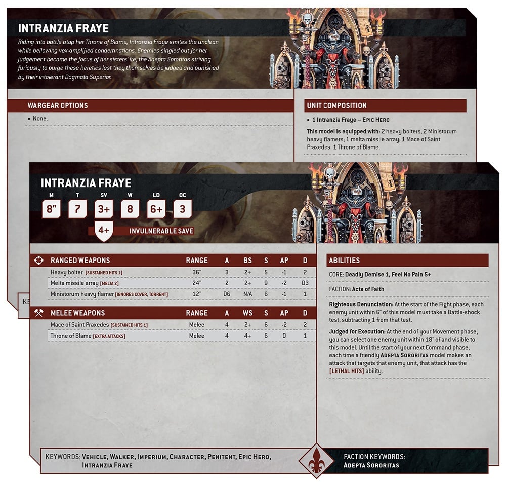 You can see her stats above and she’s on a tough chassis with 8 wounds and a 3+/4++ save. On top of that, she’s also got a Feel No Pain of 5+, too! It’s going to be rough to get damage through her defenses and make it stick. But her toughness isn’t the thing that really makes her stand out. Fraye has two abilities worth checking out. Righteous Denunciation causes battle shock tests for enemies within 6″ during the fight phase AND it’s at -1. And Judged for Execution can really pile on the damage to an enemy target because of the [Lethal Hits] that gets applied to attacks targeting them.
