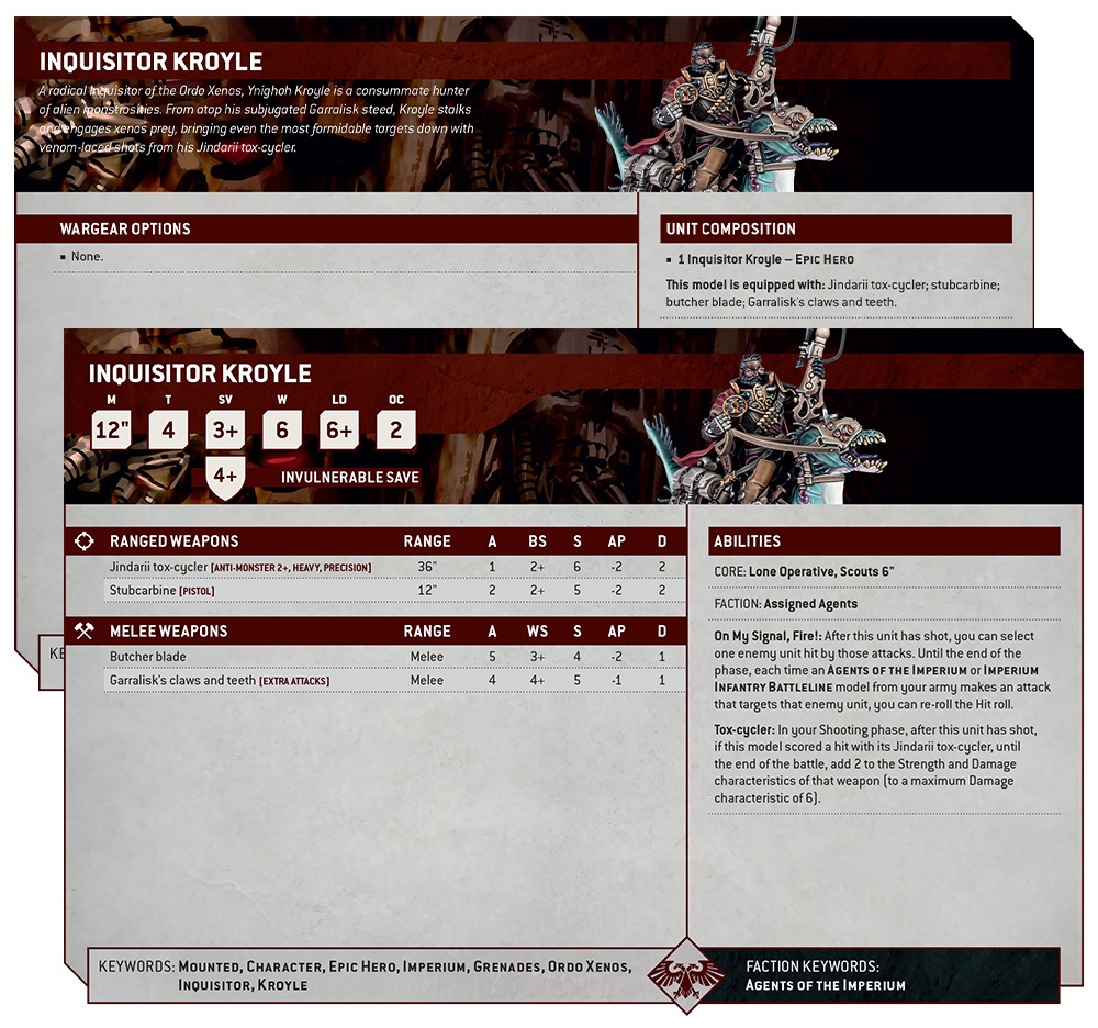 Inquisitor Kroyle is the epitome of a noble on safari. He’s fast on his mount and his Xenos rifle has a nice 36″ range. It also get stronger every time you shoot and hit something up to a max of 6 damage. Honestly, that’s kind of terrifying! On top of having the Lone Operative and a Scout move of 6″, he’s got a 3+/4++ save and 6 wounds, too. He’s really just going to prance around the tabletop and take pop-shots at whatever targets need to go away.