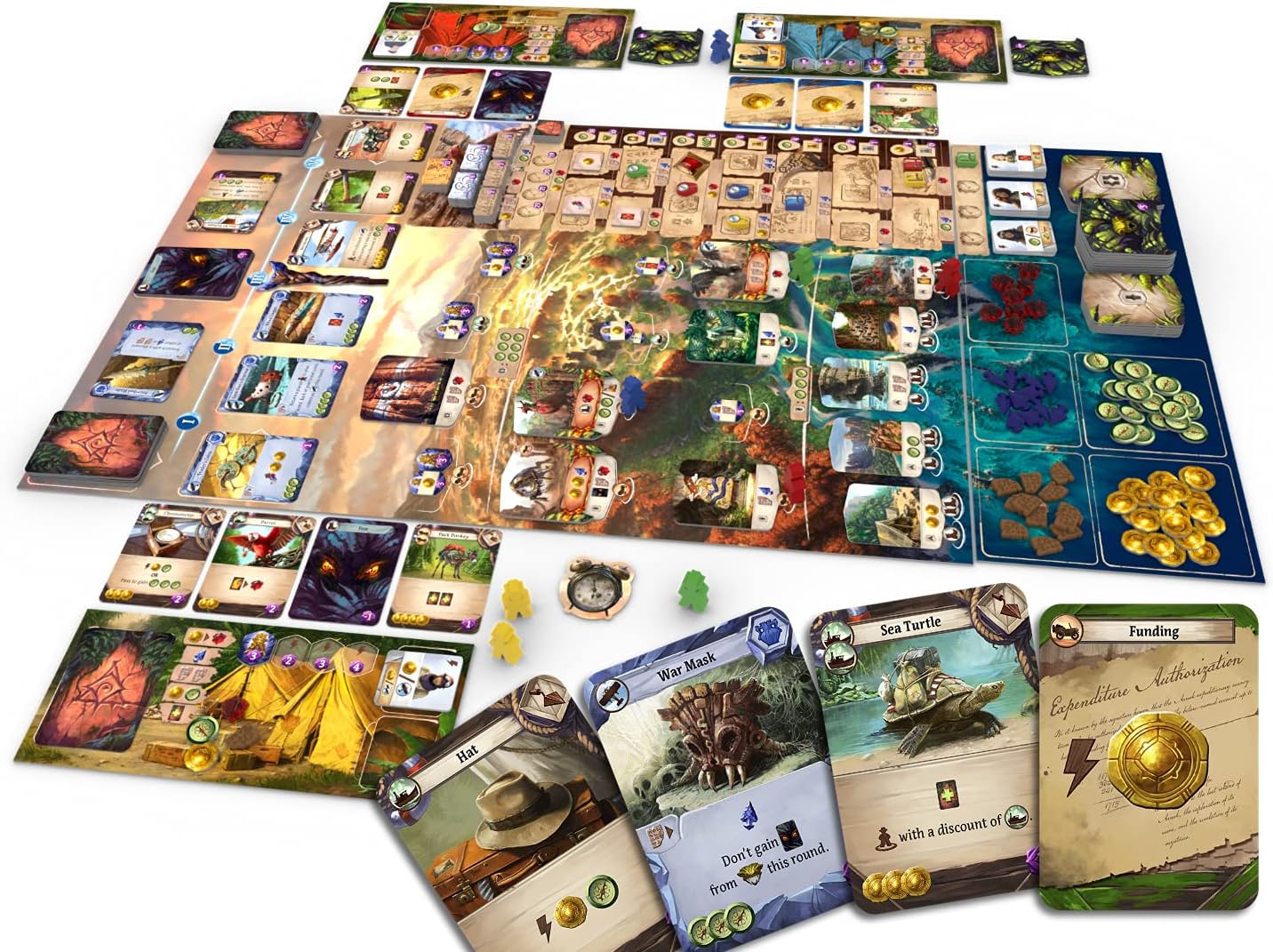 The game uses a mix of different mechanics, including deck building, resource management, discovery, and strategy. Each turn, players can take just one action, so they’ll need to be picky and thoughtful in how they choose to further their adventure and how it will help set their future moves up.