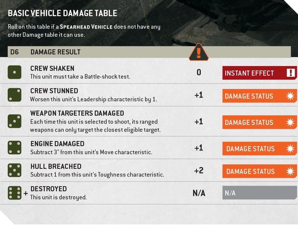 And oh God, No. NO. NOOOOOOO!!!!! Sorry, I’m having flash backs to Mech Eldar days. I know GW was joking about 40k veterans making “wistful looks into the middle distance at the mention of vehicle damage tables.” That’s not a wistful look. That’s a 1000-yard stare into the abyss. No thanks. I don’t want to go back to these. I want to drop a vehicle to 0 wounds and I want it to go away. Not have to take a check because I rolled a 1. No. Just no. /rantover
