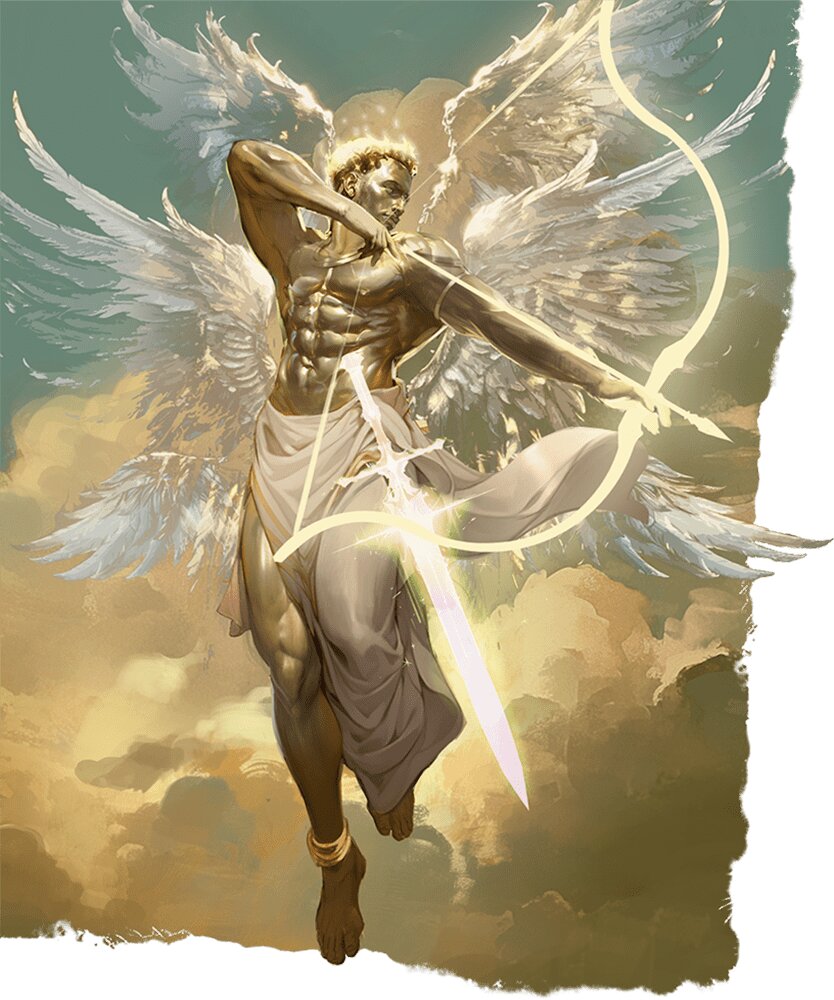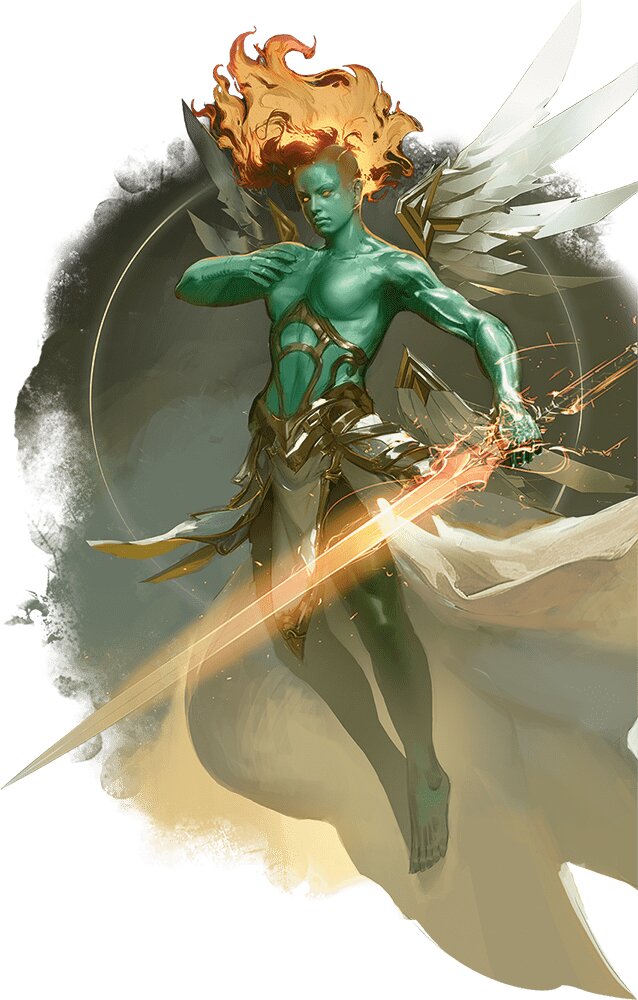 Especially since these beings are absolute units in a fight. These are designed to challenge a higher level party, weighing in at CR 23 (so a bunch of level 12 heroes might have a hard time taking one down). They can swing a sacred weapon that either does a little bit of damage and stuns you, or you can choose not to be stunned, and take extra damage from the attack. Plus they have spells and legendary actions that leave them suited to fighting multiple opponents.