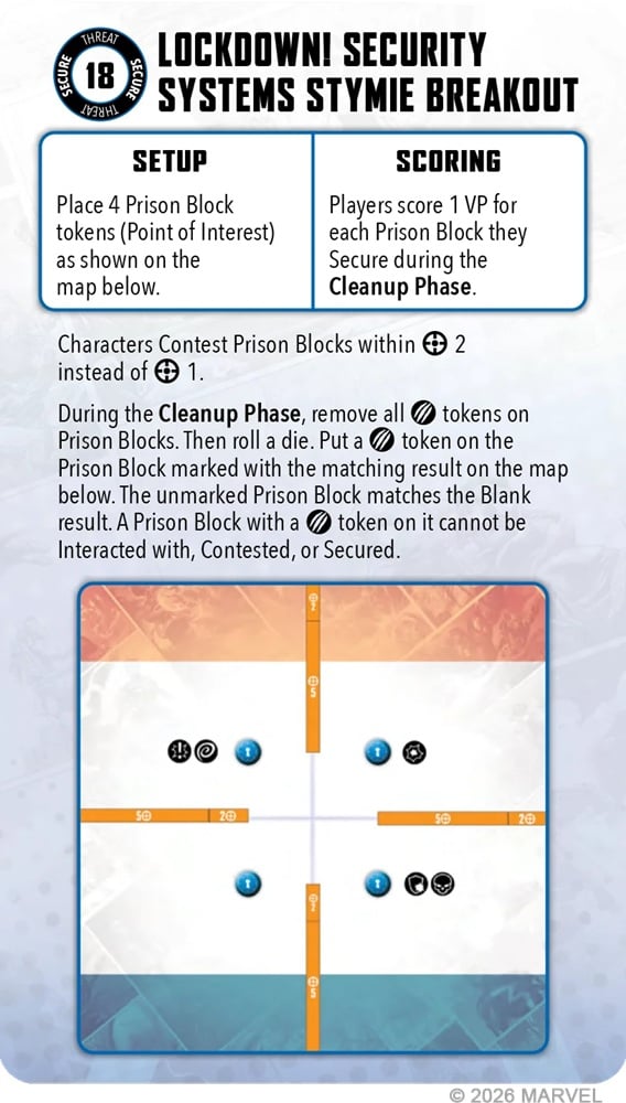The new mechanic for this one is that you’re going to randomly be unable to score one of the Prison Block objectives this turn. This is an interesting way to randomize as well.