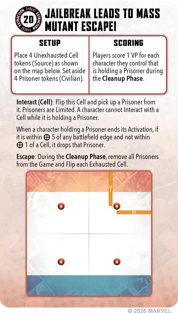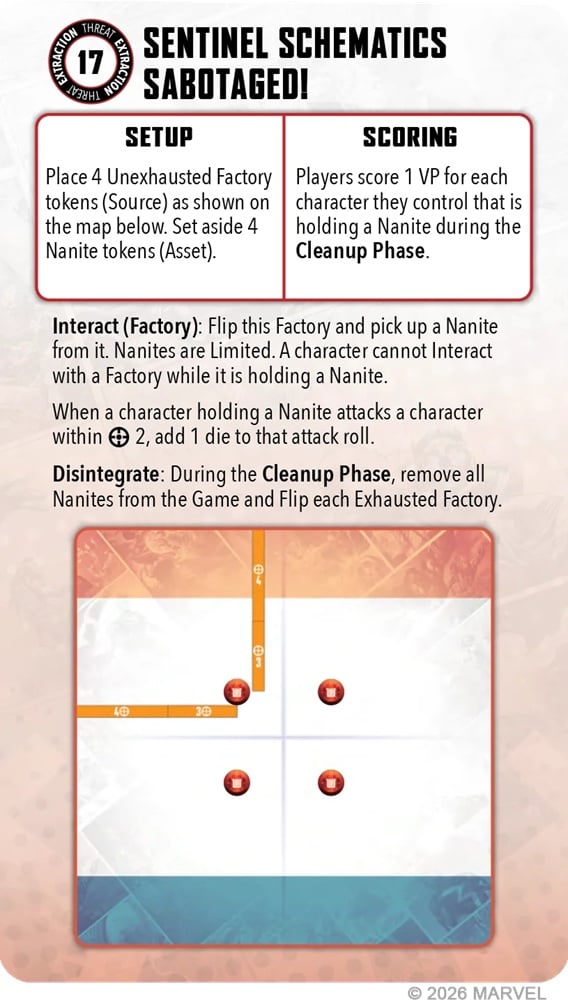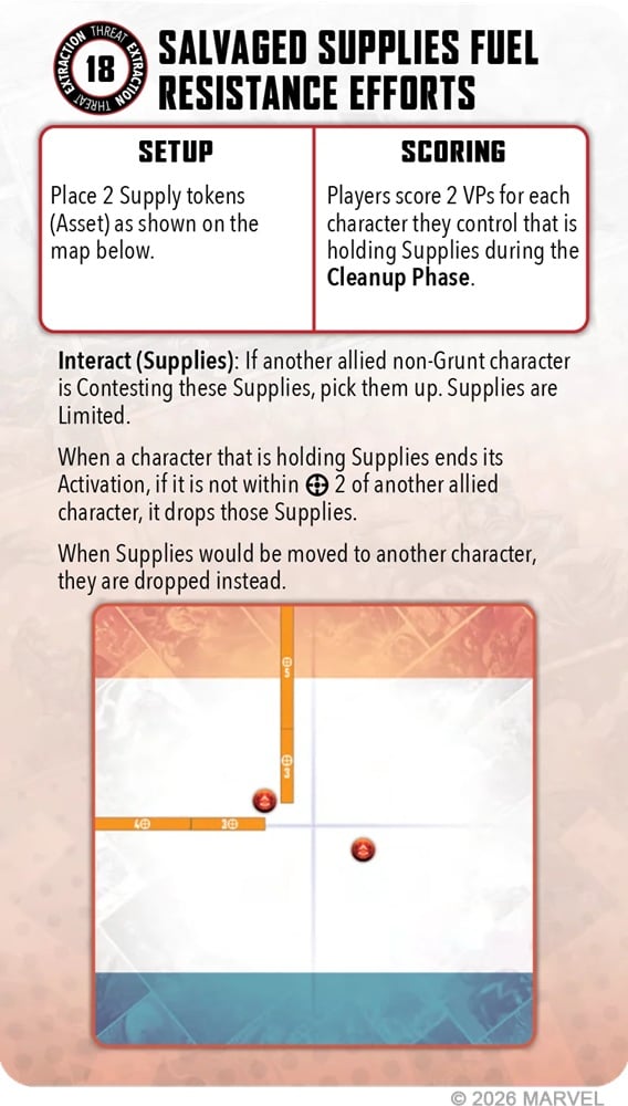 Basically, characters are going to move up, interact with the Source Tokens, and then the tokens flip. You’ll get to score them but they will then flip back and you’ll have to return to interact with them again. This is a mechanic you’ll see in many of the Extracts. This is really going to force a new style of gameplan from many of those Affiliations that like to “loot and scoot” with the Extraction Tokens.