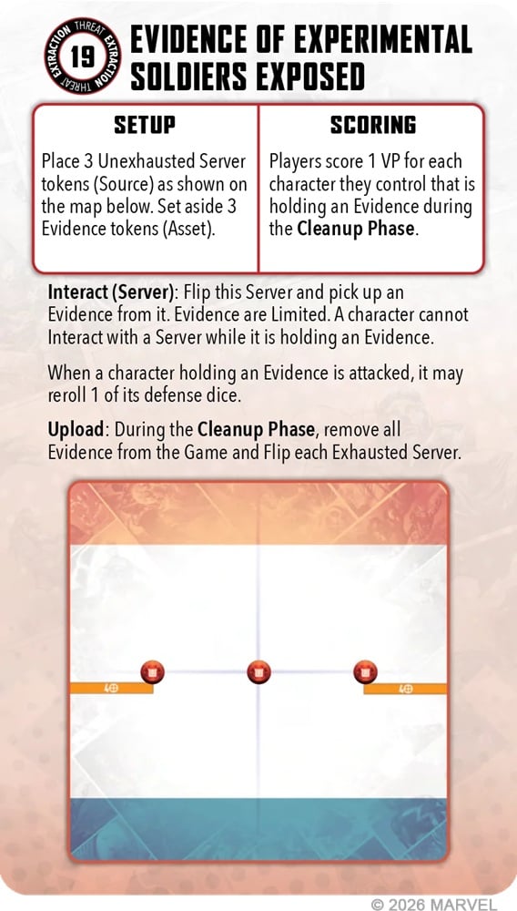 Evidence of Experimental Soldiers Exposed is a new buff for the defenders holding the Evidence. It’s a “free” re-roll for one Defense die. Again this one has resetting Source Tokens as well.