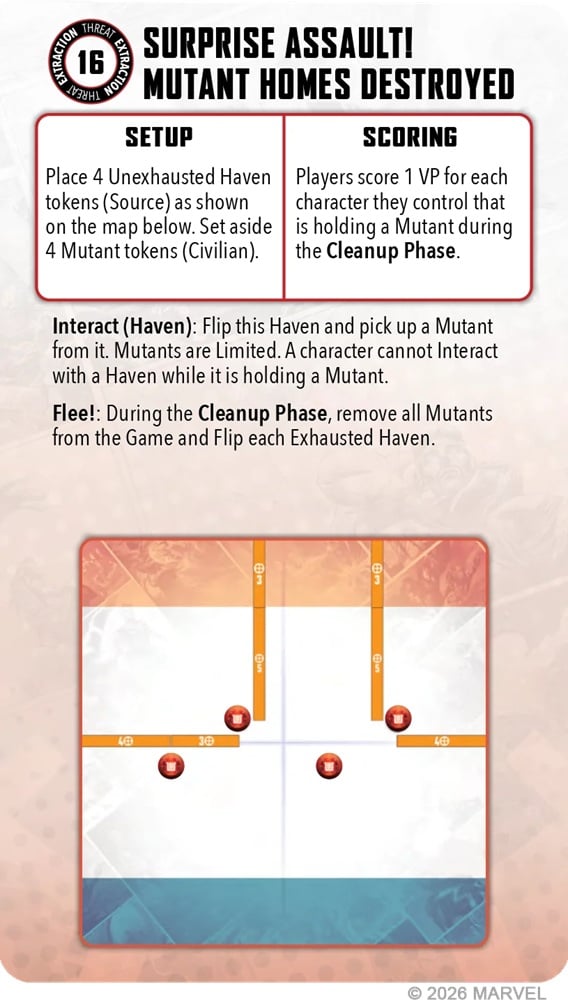 The final Extract Crisis Card is Surprise Assault! Mutant Homes Destroyed and it’s got a funky setup AND the new Source Tokens. While I am very curious as to “why” the funky new setups, I’m also glad to see them because they help to make things feel fresh. That combined with the new mechanics is really presenting a challenge for teams to overcome. Characters are going to have to spend more energy to interact with the Extracts over the course of the game, you’re going to have to return to them to score every round, and teams are going to be fighting over the timing on interacting with these, too.